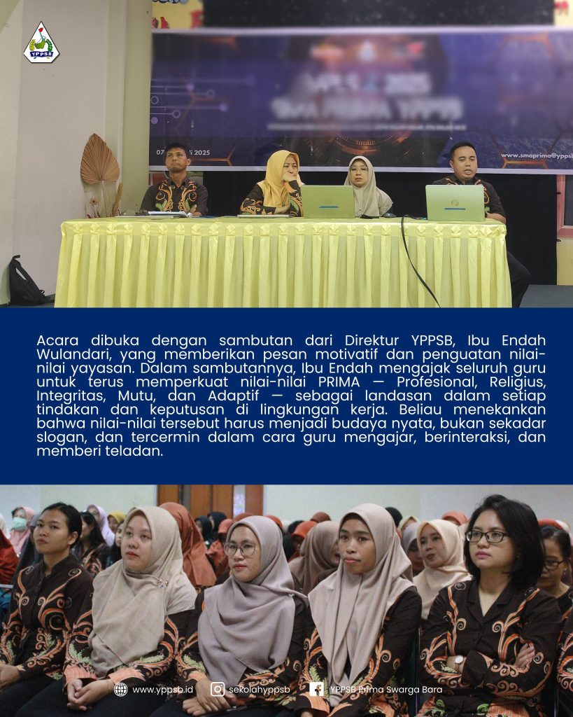 Pertemuan Awal Tahun Ajaran ini menjadi penguat komitmen seluruh pendidik untuk menghadirkan layanan pendidikan yang unggul, berkarakter, dan relevan dengan tantangan zaman, sejalan dengan nilai-nilai PRIMA yang menjadi fondasi kerja dan budaya di lingkungan YPPSB.