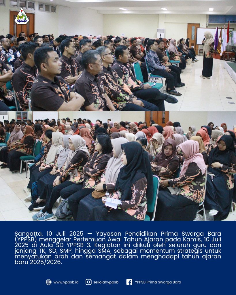 Sangatta, 10 Juli 2025 — Yayasan Pendidikan Prima Swarga Bara (YPPSB) menggelar Pertemuan Awal Tahun Ajaran pada Kamis, 10 Juli 2025 di Aula SD YPPSB 3. Kegiatan ini diikuti oleh seluruh guru dari jenjang TK, SD, SMP, hingga SMA, sebagai momentum strategis untuk menyatukan arah dan semangat dalam menghadapi tahun ajaran baru 2025/2026.